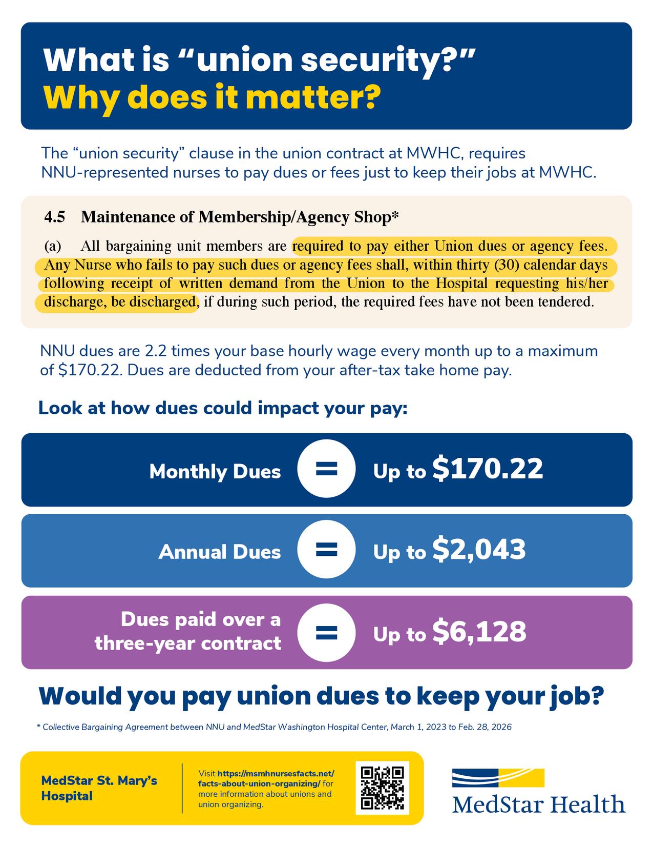 If National Nurses United (NNU) unionize nurse associates at MedStar St. Mary’s Hospital you will be required to pay monthly dues to NNU. Dues are deducted from your after-tax take home pay.